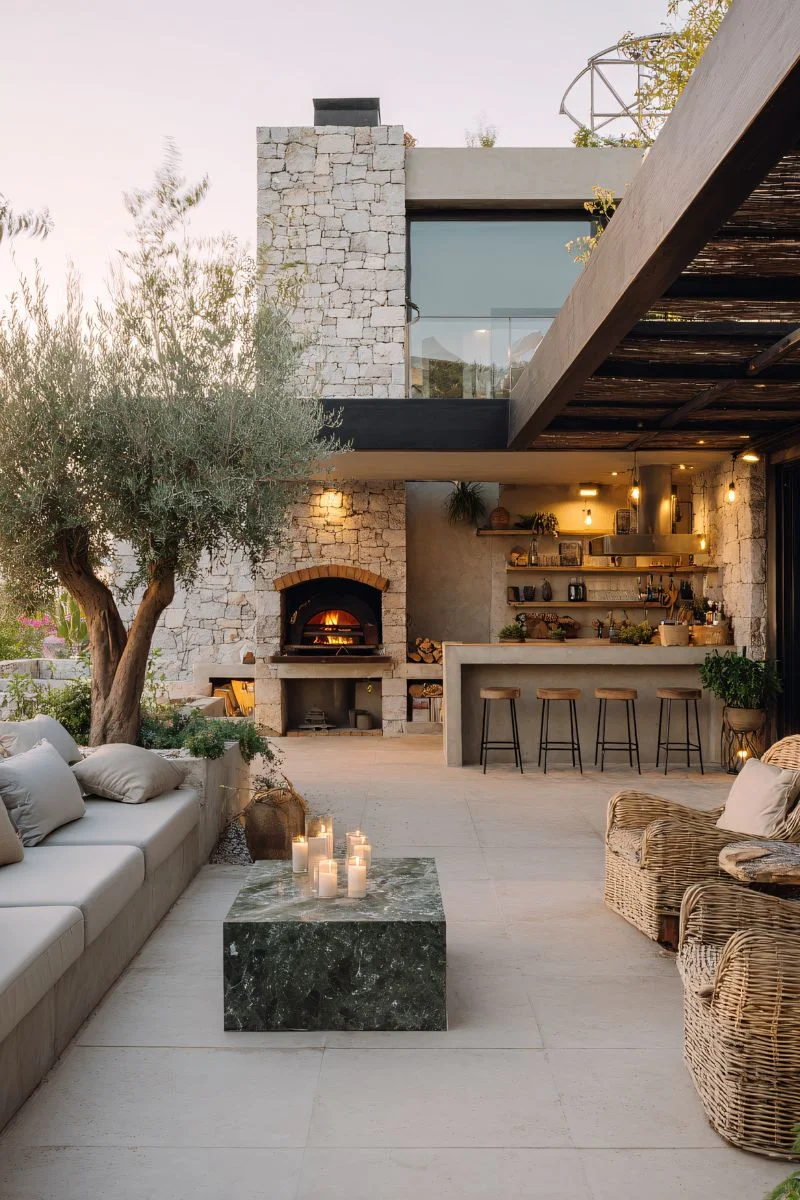 For vertical surfaces and structural elements, we specialize in natural stone masonry that creates a timeless, estate-quality look. These materials provide the strength, permanence, and visual depth required for a true outdoor kitchen—not a surface-mounted system.